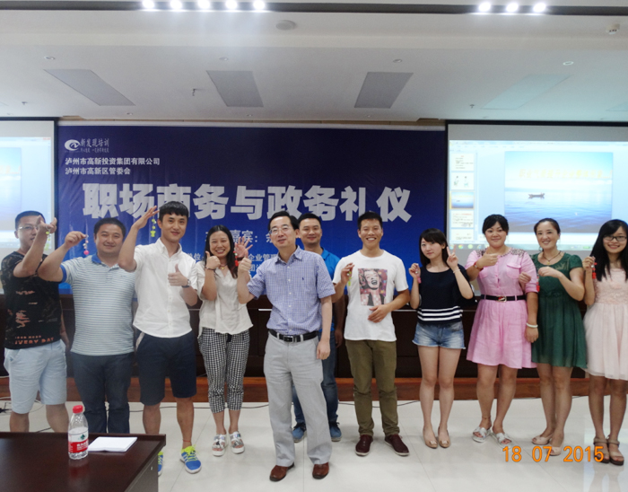 在禮儀培訓(xùn)中的游戲環(huán)節(jié)第8組成員獲獎由公司馬董事長頒發(fā)獎品